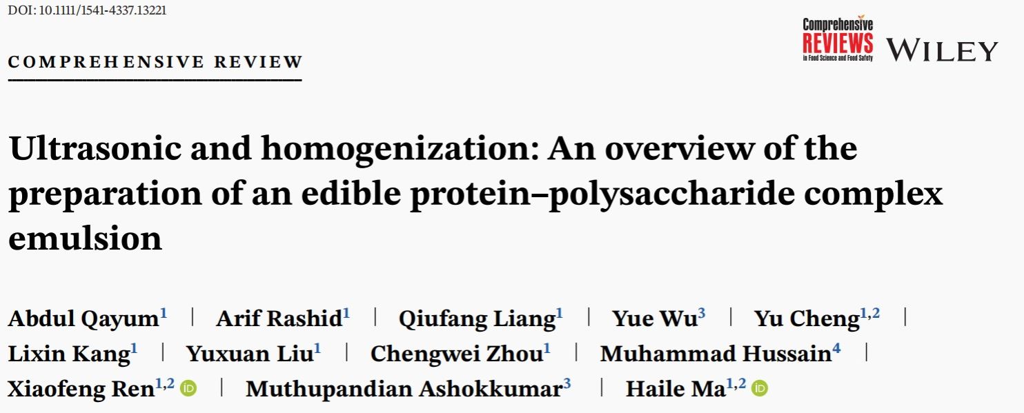 近日,江苏大学任晓锋教授课题组在国际食品安全和营养领域顶级期刊《Comprehensive Reviews in Food Science and Food Safety》(Q1,IF=14.8)在线发表了的最新研究成果——“Ultrasonic and homogenization: An overview of the preparation of an edible protein–polysaccharide complex emulsion”(DOI: 10.1111/1541-4337.13221)。bat365正版唯一官网博士后Abdul Qayum为该论文的第一作者,任晓锋教授和马海乐教授为通讯作者。Ultrasonics Sonochemistry主编、澳大利亚墨尔本大学Muthupandian Ashokkumar教授和Yue Wu博士参与了论文撰写与修改工作。