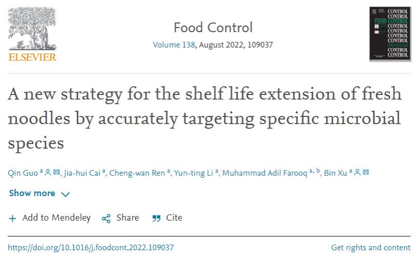 近日,bat365正版唯一官网徐斌教授在Food Control在线发表题为“A new strategy for the shelf life extension of fresh noodles by accurately targeting specific microbial species”,首次针对生鲜面中优势靶标菌株开发出新型保鲜剂。采用该方法可以提高生鲜面的保鲜准确性和保鲜效率。江苏大学郭钦副教授为第一作者,江苏大学徐斌教授和郭钦副教授为共同通讯作者。