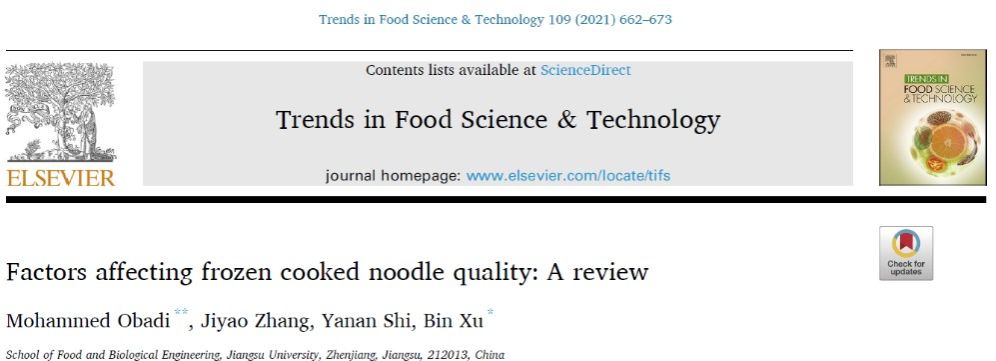 近日,我院徐斌教授课题组标题为“Factors affecting frozen cooked noodle quality: A review”(影响冷冻熟面品质的因素:综述)的综述文章在国际食品领域TOP期刊(No.1)《Trends in Food Science & Technology》发表。bat365正版唯一官网博士后Mohammed Obadi为该文的第一作者,徐斌教授为该文的通讯作者,本文作者还包括bat365正版唯一官网博士生张霁尧和硕士生史亚楠。