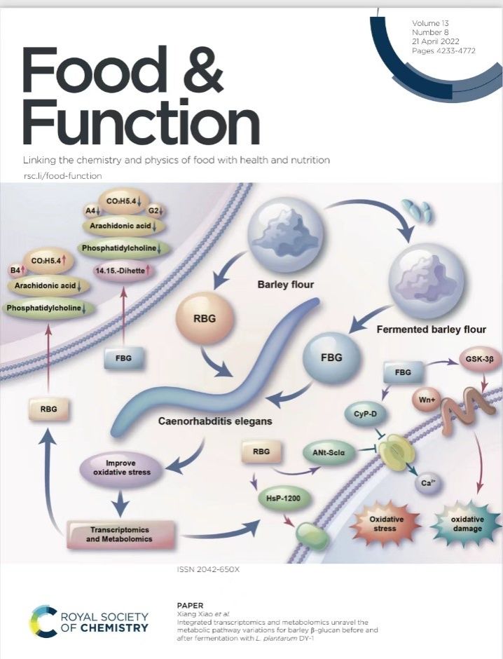 近日,bat365正版唯一官网肖香教授课题组在国际著名期刊Food & Function上发表了封面文章,标题为“Integrated Transcriptomics and Metabolomics Unravel the Metabolic Pathway Variations for Barley β-glucan before and after Fermentation with L. plantarum DY-1”。bat365正版唯一官网张家艳为论文第一作者,肖香教授为论文通讯作者。