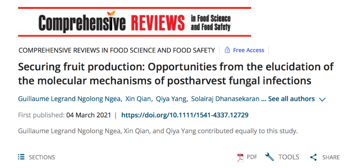 近日,bat365正版唯一官网张红印教授在Comprehensive Reviews in Food Science and Food Safety在线发表题为“Securing fruit production: opportunities from the elucidation of the molecular mechanisms of postharvest fungal infections”的综述(http://doi.org/10.1111/1541-4337.12729),系统阐述了病原菌侵染水果的分子机制及其防治策略方面的最新研究进展,该成果已被《食品科学》公众号(https://mp.weixin.qq.com/s/ze9IG8Q8TrRYFBGmcmu84w)推送,并被网易(https://www.163.com/dy/article/G4IUIETB0530N4P3.html)、今日头条(https://www.toutiao.com/i6937171261021831688/)、新浪微博等媒体广泛报道,产生了较大的学术影响。江苏大学博士后Guillaume Legrand Ngolong Ngea、硕士生钱鑫、副教授杨其亚为文章的并列第一作者;江苏大学张红印教授和意大利莫利泽大学Raffaello Castoria教授为本文的共同通讯作者。