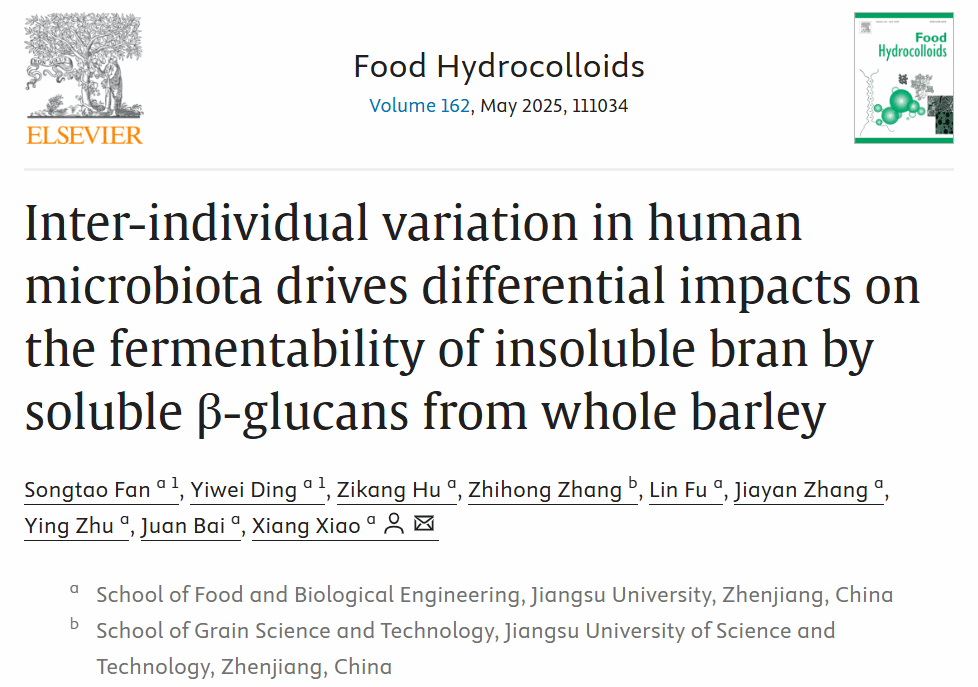 近日,我院肖香教授、范松涛讲师在在国际Top期刊《Food Hydrocolloids》(Q1,IF2023:11.0)上发表论文“Inter-individual variation in human microbiota drives differential impacts on the fermentability of insoluble bran by soluble β-glucans from whole barley”。江苏大学为第一完成单位,食生学院范松涛讲师和22级硕士研究生丁怡炜为该文共同第一作者,肖香教授为该文通讯作者。