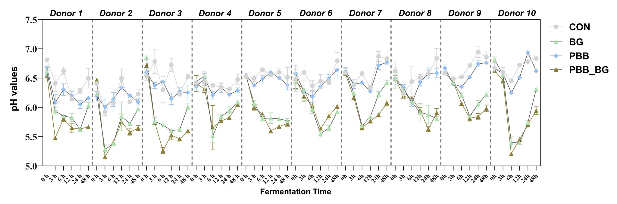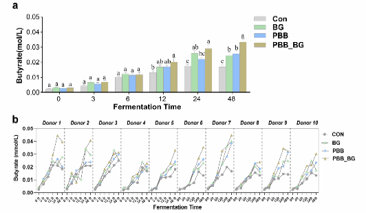 全谷物含有多种不同结构的可溶性纤维和不可溶性膳食纤维,它们共同促进人体肠道微生物健康,并有助于降低慢性疾病风险。现有研究较多关注单种结构多糖对肠道微生物的调节作用,而全谷物中可溶性纤维和不可溶性纤维在肠道酵解过程中的代谢联系仍不甚清晰。本研究使用10名健康志愿者的新鲜粪便样本,模拟肠道菌群的个体差异,并开展体外发酵实验。实验分组包括不含碳水化合物的对照组(Con),以及含大麦可溶性β-葡聚糖(BG)、含预消化大麦麸皮(PBB)、同时含BG和PBB(PBB_BG)的处理组。通过与Con组进行比较,观察菌群个体差异对BG和PBB酵解特性的影响;通过与PBB组进行比较,评估BG降解对PBB酵解特性的影响。