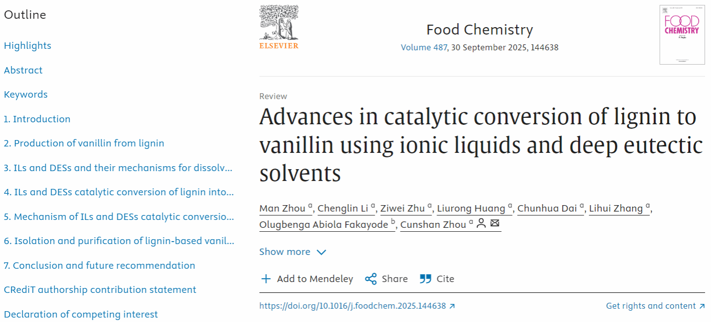 近日,我院周存山教授团队在国际Top期刊Food Chemistry上发表主题为“Advances in catalytic conversion of lignin to vanillin using ionic liquids and deep eutectic solvents”(2025, 487, 144638)的综述文章。bat365正版唯一官网周存山教授为通讯作者,周曼副教授为第一作者。本项工作得到了国家自然科学基金的支持。