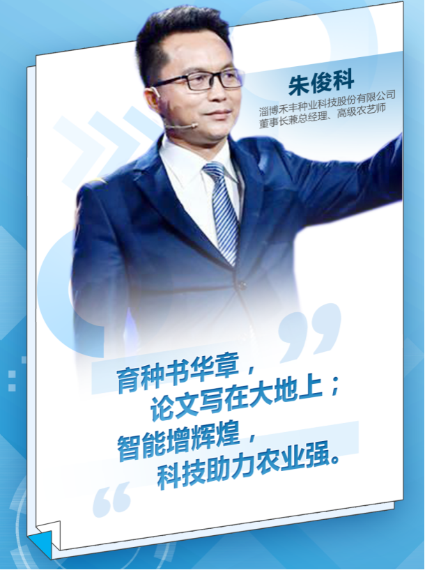 朱俊科教授介绍了个人创业历程和淄博禾丰种业科技股份有限公司的发展历史、产品简介,企业发展方向等几个方面的内容。朱教授用通俗的语言强调了乡村振兴中农产品加工的重要性:“农业不加工,等于一场空”,同时介绍了乡村振兴全产业链条的发展理念:以作物定向育种为核心技术,结合高端、循环牧业和无人农场等高新技术,形成独有的种子产业“育、繁、推、服”的全产业链条。