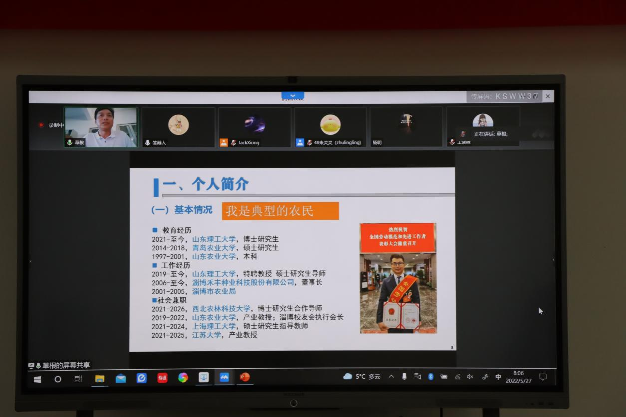2022年5月27号上午,由bat365正版唯一官网举办的“产业教授进校园活动”在食生学院302会议室顺利召开,邀请正高级农艺师、淄博禾丰种业科技股份有限公司董事长朱俊科在线上为同学们做了“小麦育种与品质研究前沿”的专题报告。副院长张红印教授主持会议,三十余名师生到场参加本次活动,另有四十余名师生线上参与学习。