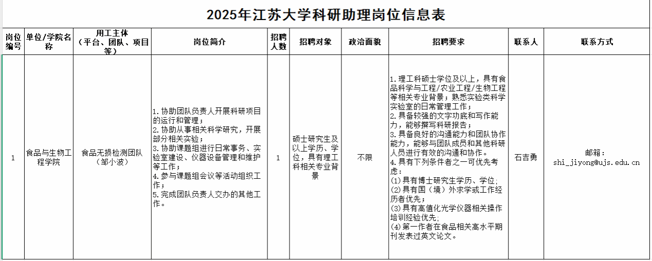 【科研助理岗位招聘】江苏大学食生学院科研助理招聘